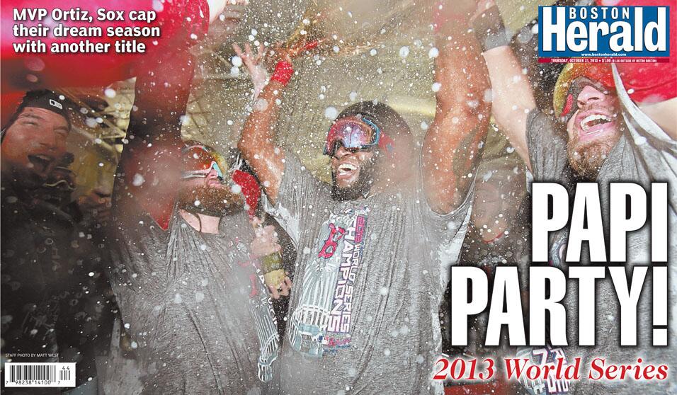 This was the front page of the Boston Herald this morning... A lot of things had to break right for the Red Sox to win this year but Koji Uehara emerging as one of the most unhittable closers in baseball was one of the biggest. Uehara my sunshine, my only sunshine... It is a lifetime of columns like this why I viscerally hate Dan Shaughnessy. I also remember how he said putting seats on the Green Monster was an abomination that was going to ruin the park... One more reason to love John Farrell - when he came out after the game to accept the trophy - he wasn't wearing one of the cheesy t-shirts or hats that have become ubiquitous at these events. I've grown to hate those hats and shirts almost as much as Dan Shaughnessy. Almost... How many licks does it take to get to the center of a Fox Sports microphone pop?... Sad to think that last night babies were born in New England hospitals and those babies have never witnessed a Red Sox World Series championship. Won't someone please think of the babies!... Semi-sad to think that some key players from the 2013 team won't be around next year. Stephen Drew will be replaced, Jacoby Ellsbury most likely will be gone as a free agent, and Jarrod Saltalamacchia who is also a free agent (though his departure is not as sure as Ellsbury)...