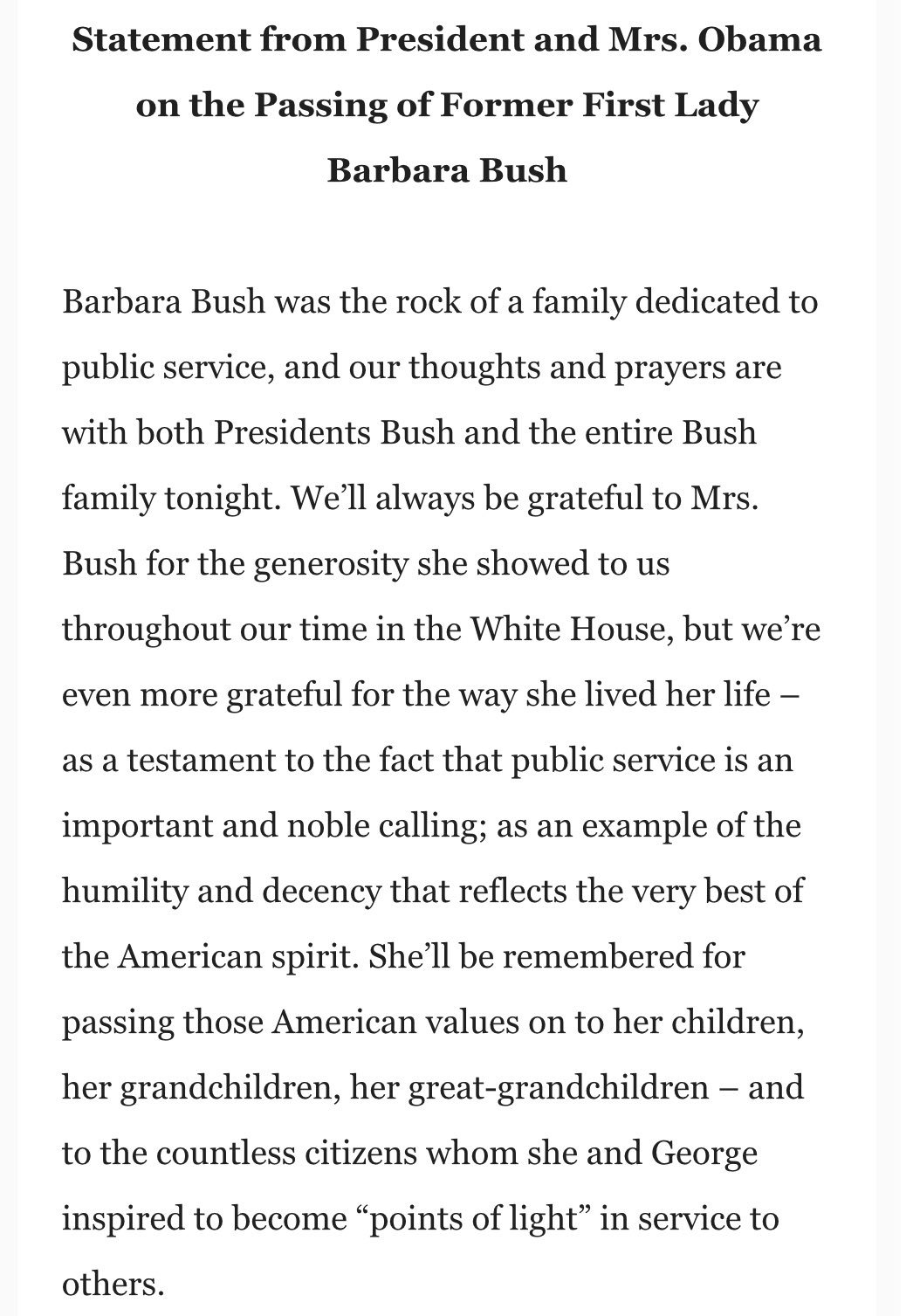 - Statement from President and Mrs. Obama on the passing of Barbara Bush.