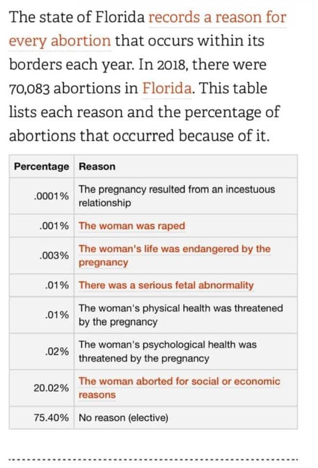 - Of the 70,083 abortions in Florida in 2018 less than .05% were for incest, rape or the life of the mother being in danger.