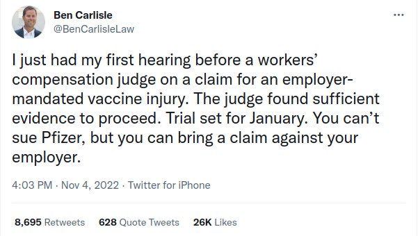 Here's hoping those who got the vax to keep their jobs and who suffered side effects will get properly compensated. Workers comp attorneys may be looking at a bonanza and the most woke companies who enforced vaccine mandates the harshest may be the hardest hit.