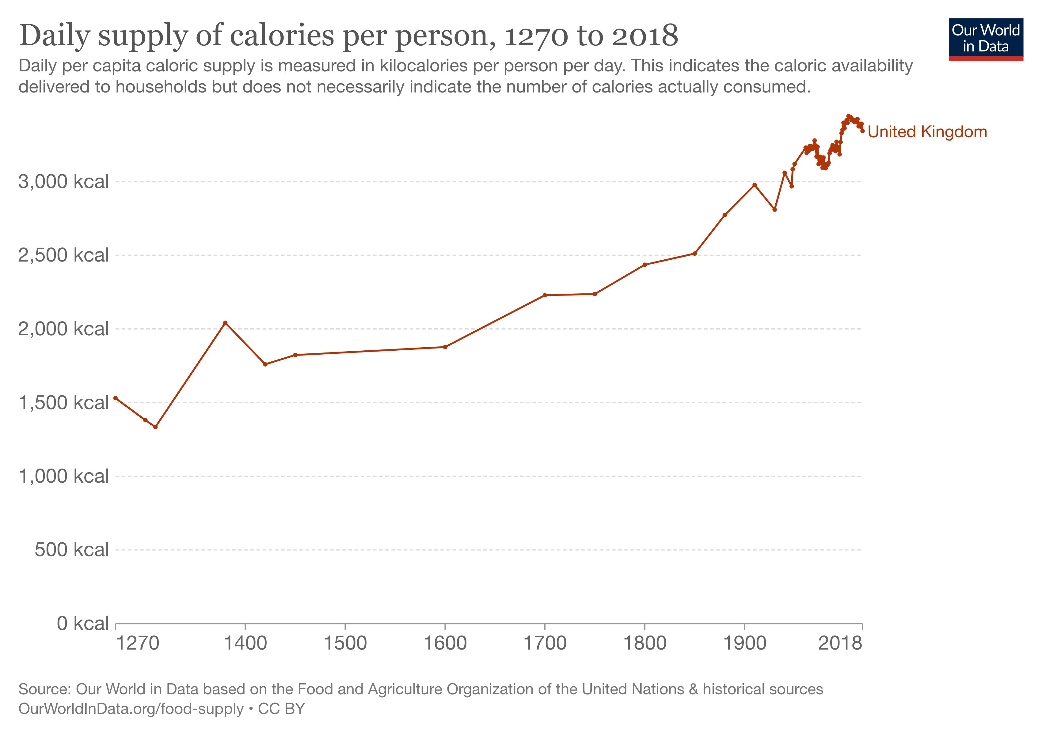 - The amount of calories consumed on average has more than doubled over time. Obesity is a much bigger problem to modern society than famines.